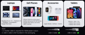 Versatile Compatibility:Charge a wide range of devices, from iPhones to MacBooks and tablets, with this multi-protocol charger.